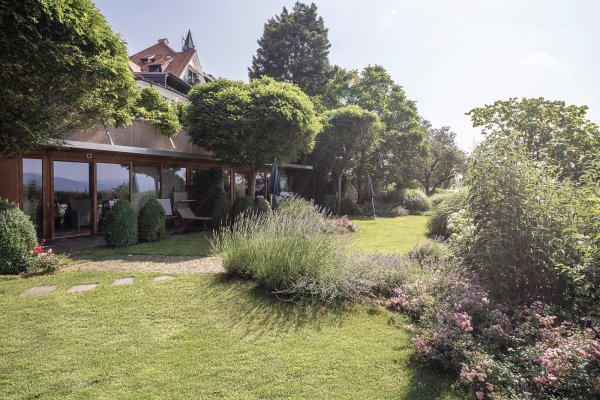 - Gartenterrasse umgeben von einem intimen Garten, mit Aussicht auf die umliegende Bergwelt und direktem Zugang zum 10.000m2 Park